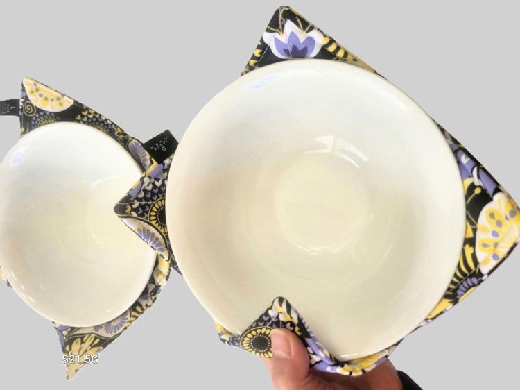 These Smart Bowl Cozies have double 100% cotton batting, 100% cotton fabric, and are microwaveable. That means your fingers are protected from burns when taking bowls out of the microwave. The fabrics and other textiles used were donated for an earlier COVID-19 project. Make Smart Bowl Cozies in 3 sizes: small, medium, and large.